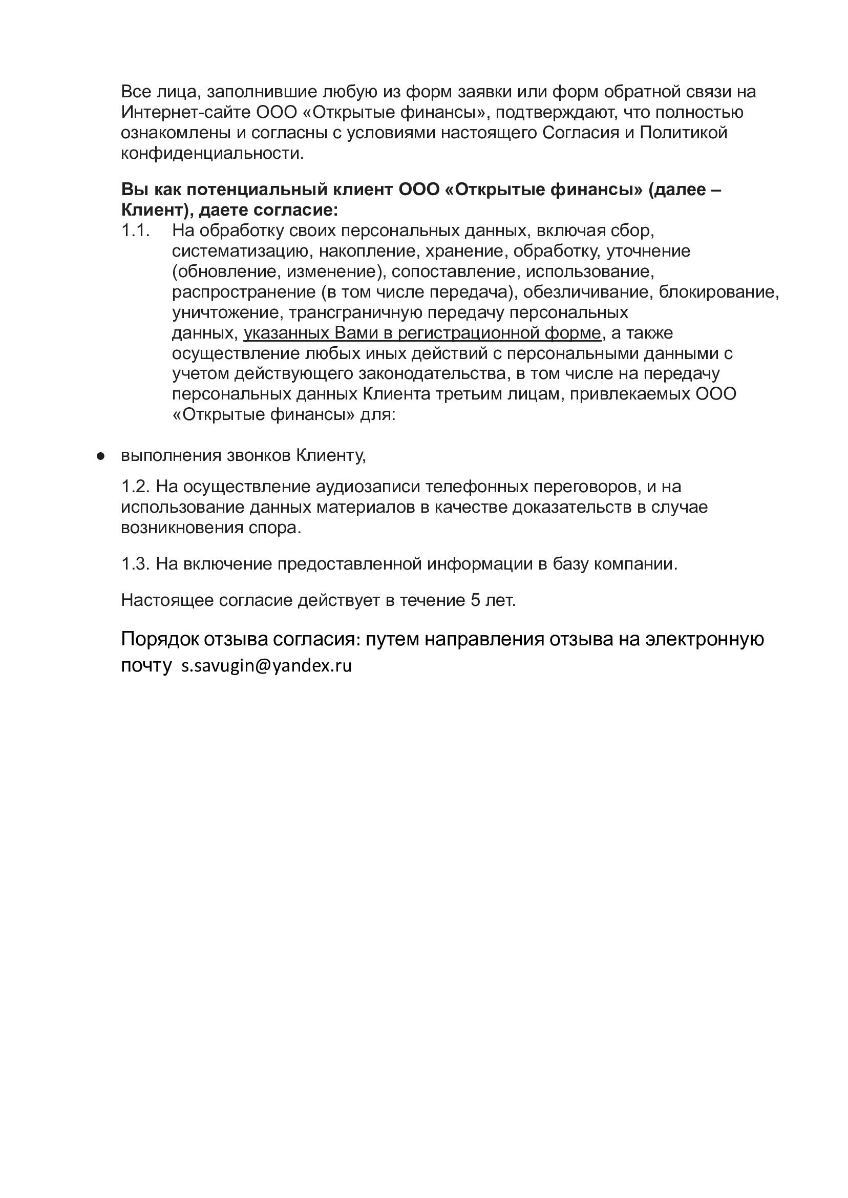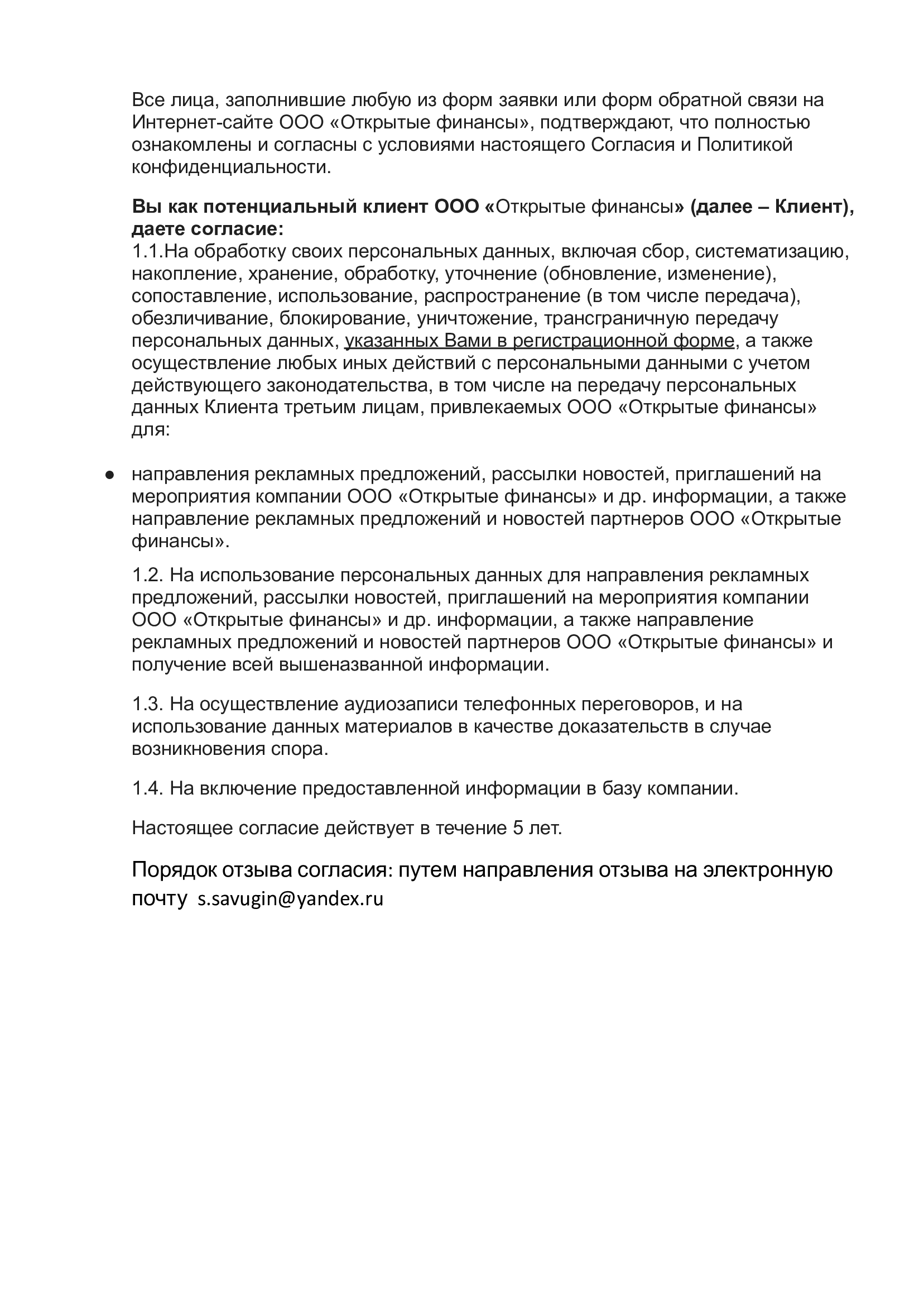 4.1.7. Предоставления Пользователю с его согласия, обновлений продукции, специальных предложений, информации о ценах, новостной рассылки и иных сведений от имени ООО «Открытые финансы» или от имени партнеров ООО «Открытые финансы».
