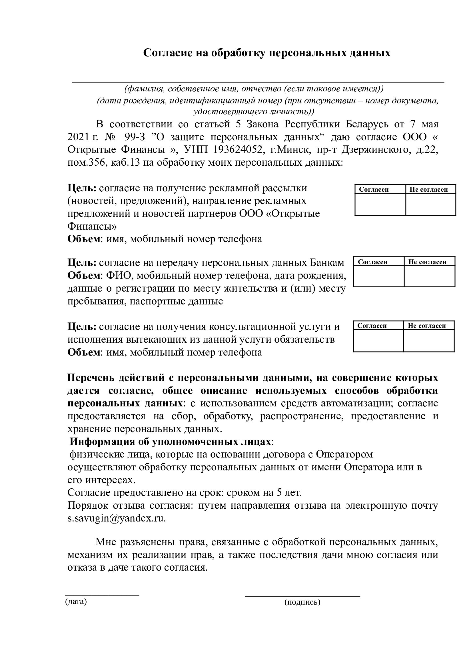 4.1.10. На использование персональных данных для рассылки новостей и рекламы услуг компании, приглашений на мероприятия компании и другой информации; направления рекламных предложений ООО «Открытые финансы», а также рекламных предложений партнеров ООО «Открытые финансы».